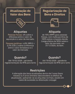 Nossas equipes de Gestão Patrimonial e Consultivo Tributário estão preparadas para orientar e conduzir todo o processo, juntamente com as assessorias de contabilidade e finanças da empresa, proporcionando tranquilidade e conformidade frente às novas regras, bem como ao aproveitamento desta oportunidade.